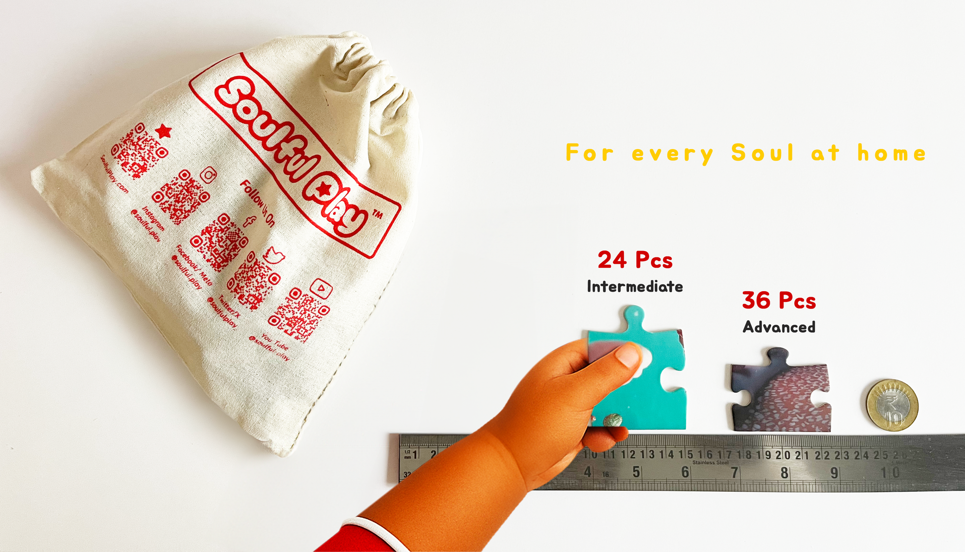 The Soulful Play Jigsaw Puzzle Bundle is designed to engage young minds through hands-on problem-solving and creativity. Perfect for kids age 4+, this set of 3 puzzles helps develop cognitive skills, hand-eye coordination, and patience while making learning fun!